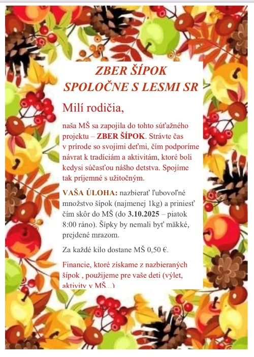 Dňa 8.10.2025 sa aj naša MŠ zapojila do osláv Svetového dňa športu. Deň sme začali spoločnou rannou rozcvičkou spolu s kamarátmi zo ZŠ na novom školskom dvore, ktorý akoby sme naším cvičením pokrstili. Pri rozcvičke sa deti rozhýbali a a zahriali celé telíčko. Cvičli s radosťou, podľa hudby a sveľkou chuťou ukazovali, akí sú z nich šikovní malí športovci. Po rozcvičke sme sa šli do MŠ nadesiatovať a potom na dlhú prechádzku do okolia MŠ, počas ktorej sme pozorovali prírodu, behali, skákali a trénovali vytrvalosť. Nechýbala ani dobrá nálada, smiech a spoločné povzbudzovvanie. Cieľom dňa bolo deti viesť k radosti z pohybu a k spoločnej spolupráci v kolektíve. Deti si deň veľmi užili a odniesli si z neho veľa pozitívnej energie. Fotky - tu.